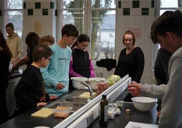 Als erstes sollten wir uns überlegen, was wir Kochen. Dann sollten wir im Internet gucken, welche Zutaten wir brauchen und anschließend das Rezept aufschreiben. Danach sind alle Gruppen mit Begleitung zum LIDL gegangen und haben das gekauft, was sie für ihr Gericht brauchen. Dann haben wir uns vorbereitet, haben Töpfe und Pfannen aufgestellt und Teller mit Besteck bereitgestellt. Nun haben wir angefangen, alle unsere Gerichte zuzubereiten. Wir haben alles gewogen, geputzt, geschnitten und gekocht. Nach zwei Stunden haben alle ihr Essen serviert. In gemeinsamer Gruppe haben wir das Essen genossen. Anschließend mussten wir alle noch mal gemeinsam anpacken, um die Küche zu reinigen. Es war für uns ein aufschlussreicher Tag. Danke an alle Eltern und Lehrkräfte für die Unterstützung. (geschrieben von Alessa und Sophie)